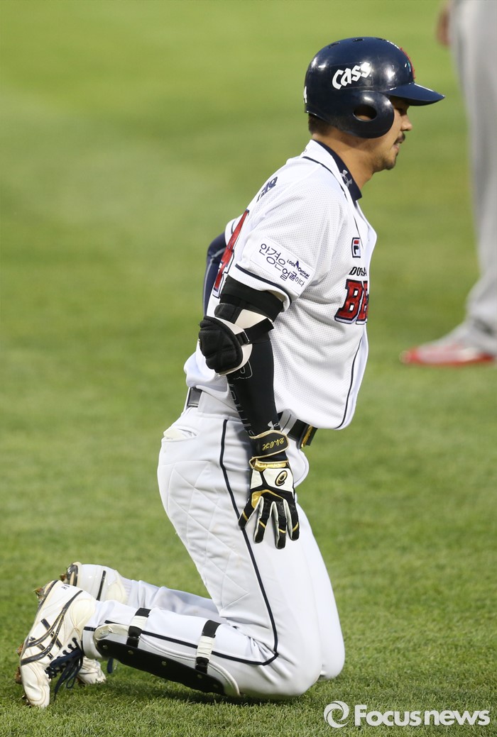 | △ 발에 공 맞은 오재원 |