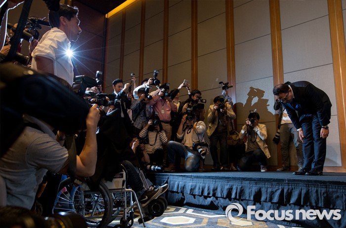 (서울=포커스뉴스) 2일 오전 서울 영등포구 콘래드호텔에서 열린 '옥시레킷벤키저(현 RB코리아) 가습기 살균제 파동' 관련 기자회견에서 아타 울라시드 사프달 옥시코리아 대표가 피해자 임성준 군에게 사과하고 있다.