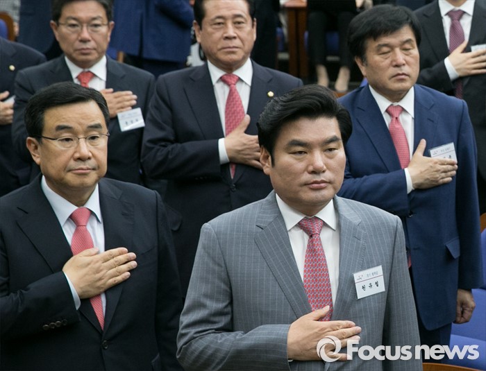 원 대행은 "국민들께선 20대 국회는 싸우는 국회가 아니라 대화하고 타협하는 상생의 정치를 하라는 준엄한 명령을 줬다"며 "새누리당은 위기를 기회로 만든 정당이다. 책임감을 갖고 단합하고 화합하는 모습을 보여준다면 국민들은 새누리당에게 기회를 줄 것이라고 확신한다"고 덧붙였다.원유철(앞줄 오른쪽) 새누리당 원내대표를 비롯한 제20대 총선 당선자들이 26일 오전 서울 여의도 국회에서 열린 당선자 워크숍에 참석해 국민의례를 하고 있다. 2016.04.26 박철중 기자