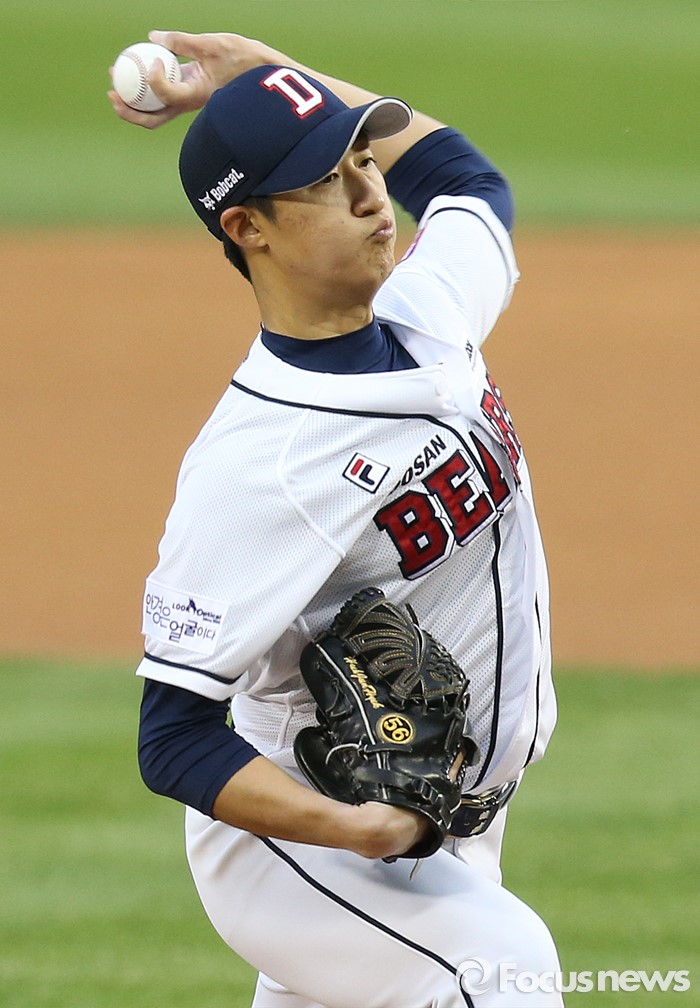 (서울=포커스뉴스) 27일 서울 잠실구장에서 열린 2016 프로야구 SK-두산 경기에서 1회초 두산 선발투수 허준혁이 투구하고 있다.