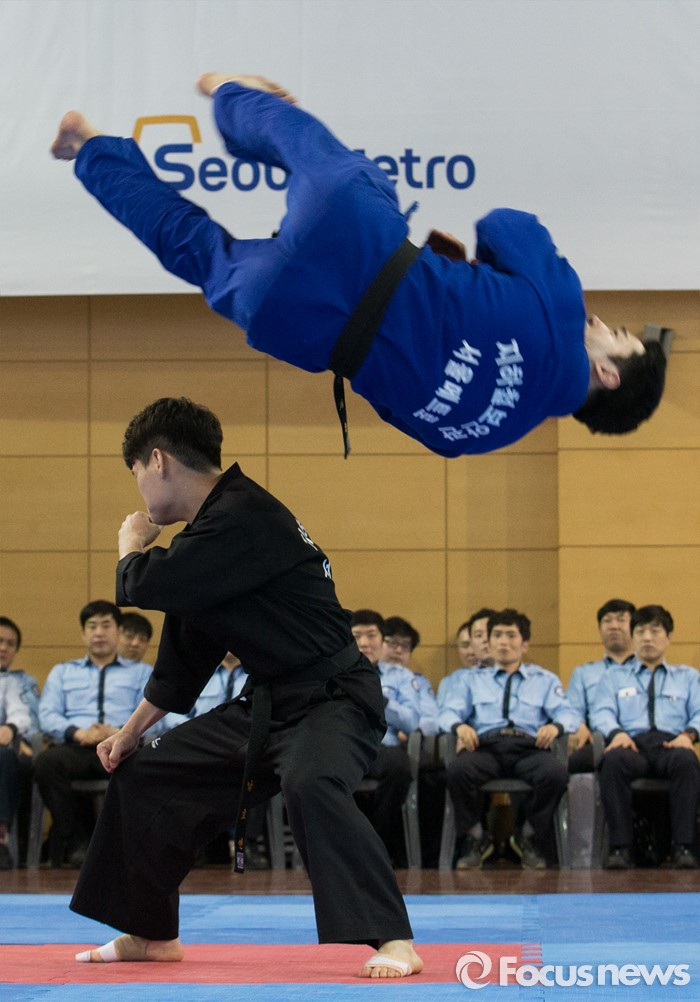 (서울=포커스뉴스) 28일 오후 서울 성동구 서울메트로 인재개발원에서 열린 지하철보안관 무술 경연 대회에서 서울메트로 소속 지하철보안관들이 낙법 시험을 선보이고 있다.