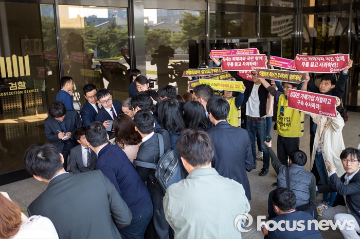 (서울=포커스뉴스) 수 많은 목숨을 앗아간 가습기 살균제가 만들어졌을 당시 옥시 최고경영자를 지낸 신현우 전 옥시 대표가 26일 오전 서울 서초구 서울중앙지검에 피의자 신분으로 출석 하며 취재진에게 질문을 받고 있다. 사진 오른쪽은 가습기 살균제 피해 가족들.