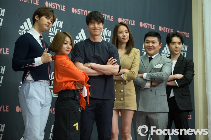 (서울=포커스뉴스) 26일 오전 서울 마포구 스탠포드 호텔에서 열린 온스타일 '마이 보디가드' 제작발표회에 참석한 출연진이 포토타임을 갖고 있다. 왼쪽부터 가수 신우, 개그우먼 박나래, 배우 이동욱, 조윤희, 개그맨 조세호, 웹툰작가 박태준.