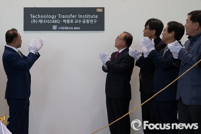 (서울=포커스뉴스) 25일 오전 서울 관악구 서울대학교 수의과대학 생명공학 연구동에서 열린 서울대-BBQ 공동연구 조인식에서 윤홍근(왼쪽) 제너시스비비큐 그룹 회장과 박용호 서울대 수의과대학 교수가 현판식을 하고 있다.