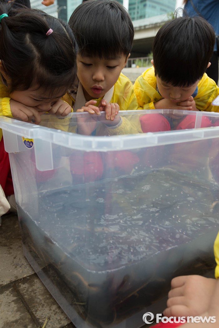 (서울=포커스뉴스) 27일 오전 서울 영등포구 여의도 샛강생태공원에서 어린이들이 모기 퇴치를 위해 방류될 미꾸라지를 구경하고 있다.