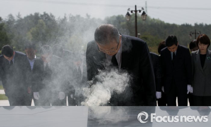 (광주=포커스뉴스) 김종인 더불어민주당 비대위 대표가 25일 오전 광주 북구 국립 5·18민주묘지를 방문해 20대 총선 당선인 및 광주·전남지역 낙선 인사들과 참배를 하고 있다.