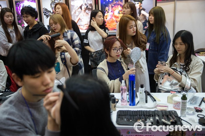 (서울=포커스뉴스) 28일 오전 서울 삼성동 코엑스에서 열린 2016 국제건강산업박람회에서 시민들이 메이크업을 체험하고 있다.