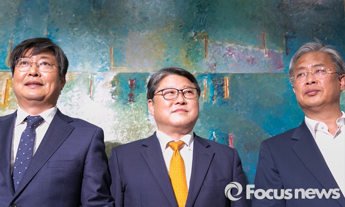 (서울=포커스뉴스) 조원진(가운데) 새누리당 원내수석부대표, 이춘석(왼쪽) 더불어민주당 원내수석부대표, 유성엽 국민의당 원내수석부대표가 27일 오후 서울 여의도 국회에서 19대 마지막 임시국회 의사일정 및 쟁점법안 등 논의를 위한 회동에 앞서 취재진을 향해 포즈를 취하고 있다.