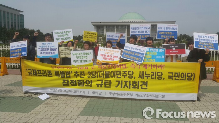 의사협회 또한 의료에 대한 규제 완화를 추진하기 위해서는 △국민의 생명과 건강 보호라는 목적을 달성할 수 있어야 하고 △일차의료를 기저로 한 보건의료체계를 유지·발전할 수 있어야 하고 △의료전문가의 현장 의견을 반드시 수렴해야 사회적 갈등과 비용을 줄일 수 있다며 특별법안에서의 의료분야 철회를 촉구하고 있다.28일 오전 11시 국회 앞에서 의료민영화저지범국본 및 무상의료운동본부 등 시민단체가 '규제프리존 특별법' 추진 3당(더불어민주당, 새누리당, 국민의당) 잠정 합의규탄 기자회견을 열었다.2016.04.28 조안나 기자 28일 오전 11시 국회 앞에서 의료민영화저지범국본 및 무상의료운동본부 등 시민단체가 '규제프리존 특별법' 추진 3당(더불어민주당, 새누리당, 국민의당) 잠정 합의규탄 기자회견을 열었다.2016.04.28 조안나 기자