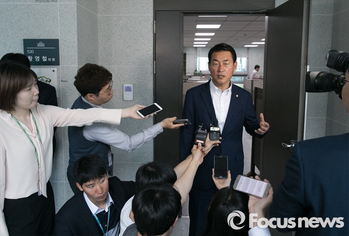 (서울=포커스뉴스) 새누리당 혁신모임 간사인 황영철 의원이 2일 오전 서울 여의도 국회 의원회관 의원실에서 비공개 논의 중 나와 취재진 질문에 답하고 있다.