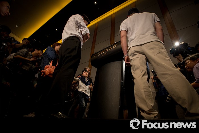 (서울=포커스뉴스) 2일 오전 서울 영등포구 콘래드호텔에서 열린 '옥시레킷벤키저(현 RB코리아) 가습기 살균제 파동' 관련 기자회견에서 아타 울라시드 사프달 옥시코리아 대표가 피해자 가족들에게 항의 받고 있다.