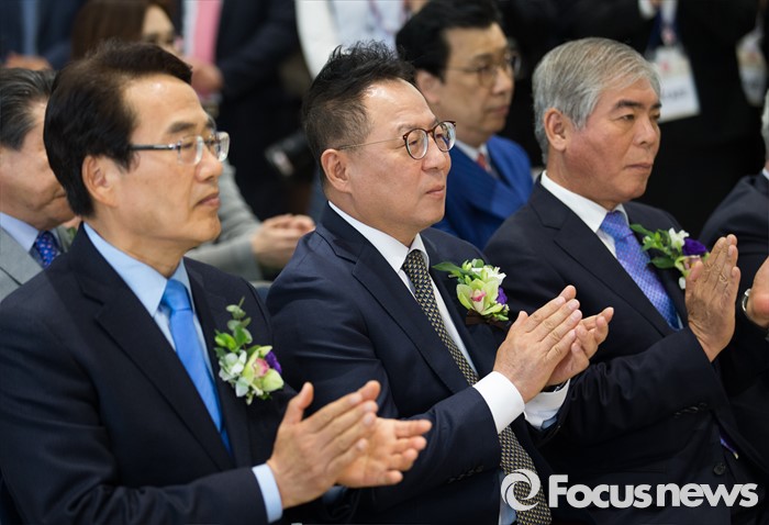 (서울=포커스뉴스) 29일 오전 서울 종로구 SM면세점 서울점에서 열린 그랜드 오픈식에 참석한 내빈들이 박수치고 있다. 왼쪽부터 박상환 하나투어 회장, 권희석 SM면세점 대표이사, 양무승 한국여행업협회 회장.