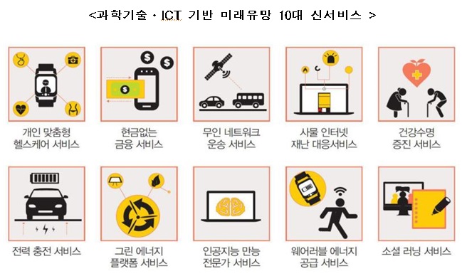 이광형 미래준비위원회 위원장은 “이번 보고서가 우리나라가 저성장시대를 넘어서, 더 나은 미래로 나아가는 데 기여하기를 바란다”고 말했다.미래준비위원회가 내놓은 미래유명 10대 신서비스.<그림제공=미래부>