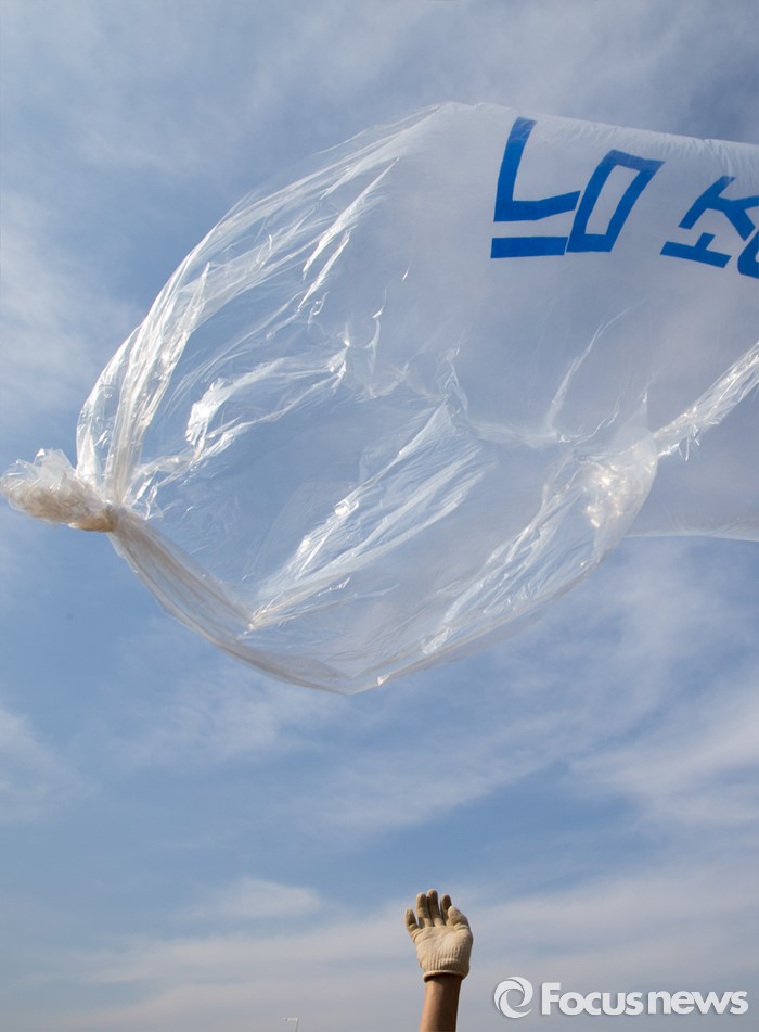 (파주=포커스뉴스) 29일 오후 경기 파주 낙하IC 인근에서 탈북자단체인 자유북한운동연합이 북한에 핵과 미사일을 포기하고 국제사회 일원으로 참여할 것을 촉구하는 내용의 대북전단을 날려보내고 있다.
