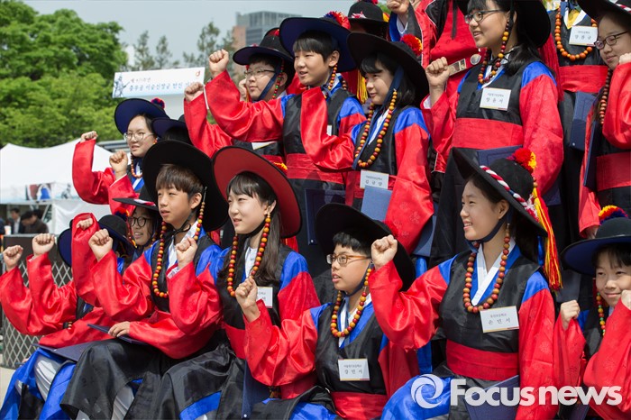 (서울=포커스뉴스) 28일 오전 서울 중구 남산골한옥마을에서 열린 '충무공 탄생 471주년 기념 다례식'에서 소년소녀 이순신으로 선택된 초등학생들이 참석자들과 기념촬영을 하고 있다.