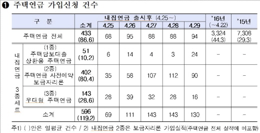 금융위원회는 지난 4월 25일 출시된 내집연금 3종세트 이후 29일까지 5일간 주택연금 가입신청건수를 집계한 결과, 일평균 86.6건을 기록했다고 1일 발표했다. 이는 2015년 일평균 가입신청건수인 29.3건의 약 3배 수준이다.