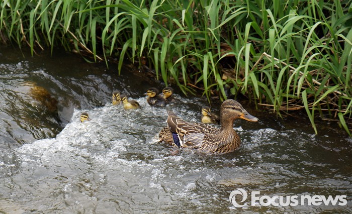 (과천=포커스뉴스) 만물이 소생하는 봄이다. 27일 경기도 과천 양재천에 청둥오리가 갓 부화한 새끼들을 데리고 봄나들이 나왔다. 물살이 센곳을 미끄럼 타듯 지나는 새끼들은 마냥 즐겁다.