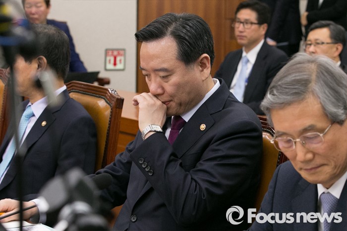 (서울=포커스뉴스) 김현웅 법무부 장관이 28일 오후 서울 여의도 국회에서 열린 법제사법위원회 전체회의에 출석해, 생각에 잠겨 있다.