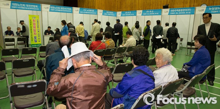 (대전=포커스뉴스) 28일 오후 대전 서구 노인복지관 3층 대강당에서 열린 찾아가는 시니어 취업 박람회를 찾은 구직희망자들이 구직상담을 기다리고 있다.