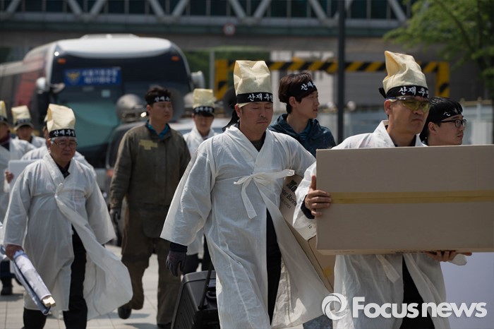 (서울=포커스뉴스) 29일 오후 서울 종로구 정부서울청사 앞에서 상경한 현대중공업노조원들이 구조조정 중단 및 산업현장 안정을 촉구하며 기자회견을 하고 있다.