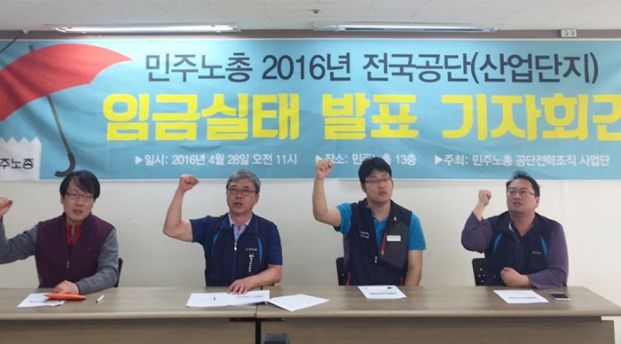 아울러 최저임금 지급을 지키지 않는 사업장에 대해선 정부 당국의 엄중한 처벌을 촉구했다.민주노총이 28일 서울 중구 민주노총 사무실에서 기자회견을 열고 2016년 전국 공단 노동자 임금실태를 발표했다. 박지선 기자