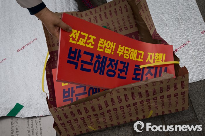 (서울=포커스뉴스) 27일 오후 서울 종로구 정부종합청사 앞에서 전교조(전국교직원노동조합)와 민주교육과 전교조 지키기 전국행동의 주최로 법외노조 후속조치 규탄 및 부당해고 저지, 노동기본권 쟁취를 위한 집회가 열리고 있다.