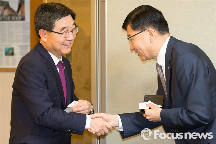 (서울=포커스뉴스) 이기권 고용노동부 장관이 28일 오전 서울 중구 한국프레스센터에서 열린 '30대 그룹 CEO 간담회'에서 참석자들과 인사를 나누고 있다.