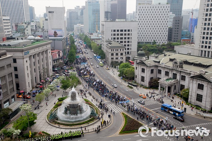 (서울=포커스뉴스) 30일 오후 서울역 광장에서 민주노총 공공운수 전국철도노동조합 회원들이 '철도노동자 1차 총력 결의대회'를 마치고 시내를 행진하고 있다.