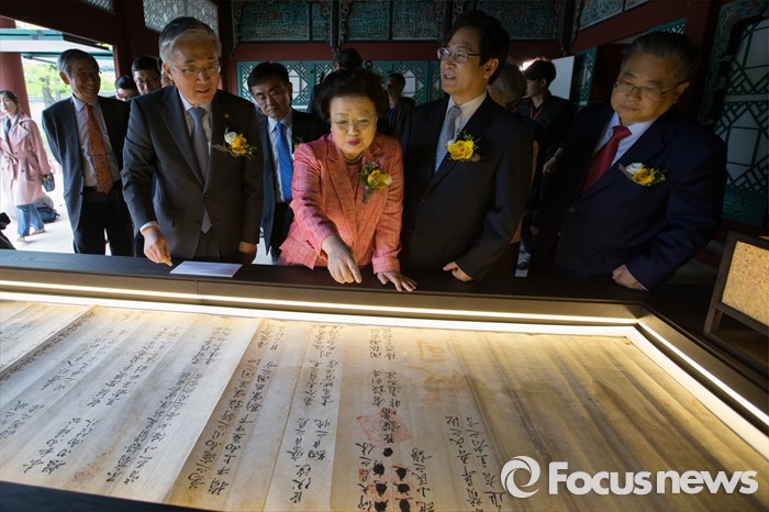(서울=포커스뉴스) 27일 오후 서울 종로구 경복궁 집옥재에서 열린 궁궐 속 작은도서관 집옥재 개관행사를 마친 뒤 김종덕(왼쪽) 문화체육관광부 장관과 이배용 한국학중앙연구원 원장이 내부를 둘러보고 있다.