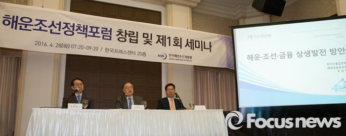 (서울=포커스뉴스) 28일 오전 서울 중구 한국프레스센터에서 열린 '해운조선정책포럼 창립 및 제1회 세미나'에 김성귀(왼쪽부터) 한국해양수산개발원 원장, 전준수 서강대학교 교수, 조규열 해양금융종합센터장이 참석하고 있다.
