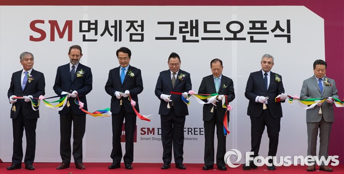 (서울=포커스뉴스) 29일 오전 서울 종로구 SM면세점 서울점에서 열린 그랜드 오픈식에 참석한 내빈들이 테이프 커팅을 하고 있다. 왼쪽부터 양무승 한국여행업협회 회장, 마르코 델라 세타 주한이탈리아대사, 박상환 하나투어 회장, 권희석 SM면세점 대표이사, 김동호 전 문화융성위원회 위원장, 다니엘 메이란 부루벨 코리아 사장, 김삼중 에스제이듀코 대표.