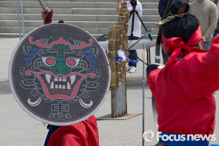 (서울=포커스뉴스) 28일 오전 서울 중구 남산골한옥마을에서 열린 '충무공 탄생 471주년 기념 다례식'에서 무예공연이 펼쳐지고 있다.