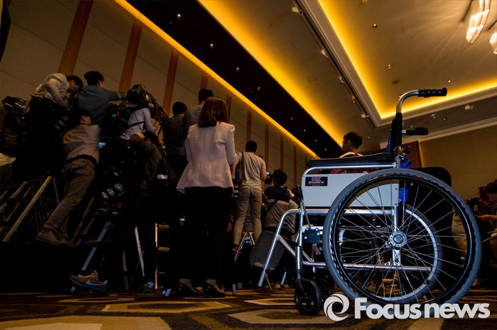 (서울=포커스뉴스) 2일 오전 서울 영등포구 콘래드호텔에서 열린 '옥시레킷벤키저(현 RB코리아) 가습기 살균제 파동' 관련 기자회견에 피해자 임성준 군의 휠체어가 놓여 있다.