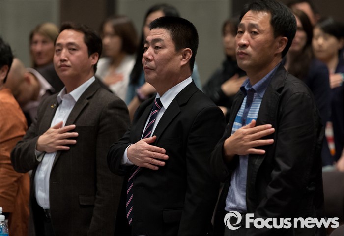 (서울=포커스뉴스) 28일 오후 서울 중구 프레스센터에서 북한정권 붕괴 후 탈북민들의 역할 대토론회에 참석한 김광진(가운데) 전 북한군 연대장 상좌가 국민의례를 하고 있다.