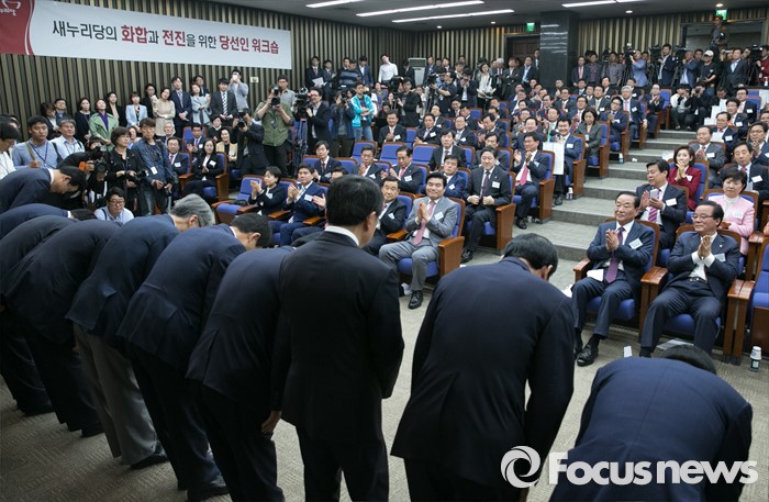 (서울=포커스뉴스) 26일 오전 서울 여의도 국회에서 열린 새누리당 20대 총선 당선자 워크숍에 참석한 경남지역 당선인들이 인사하고 있다.