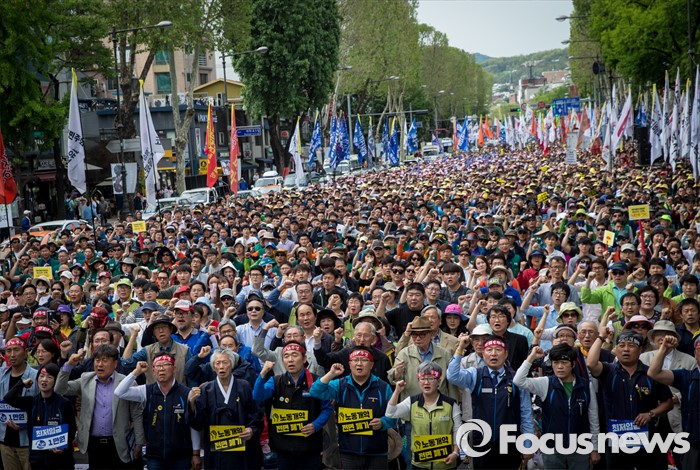 (서울=포커스뉴스) 근로자의날을 맞은 1일 오후 서울 종로구 대학로에서 민주노총 주최로 열린 '2016 세계노동절대회' 참가자들이 구호를 외치고 있다.
