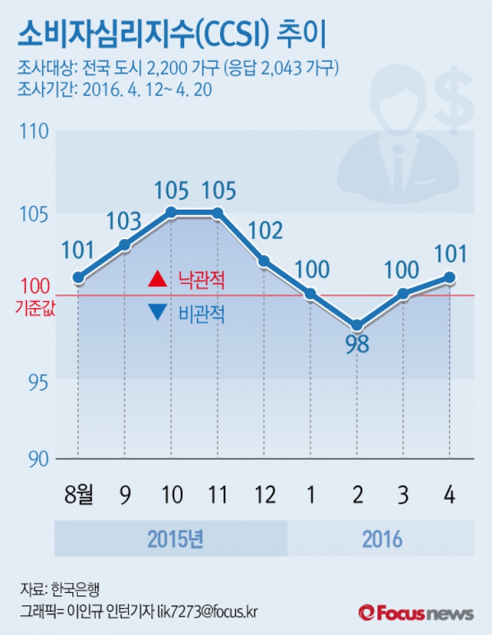 (서울=포커스뉴스) 27일 한국은행이 발표한 '2016년 4월 소비자동향조사 결과'에 따르면 4월 소비자심리지수(CCSI)는 101로 전월 대비 1포인트 상승했다고 밝혔다.