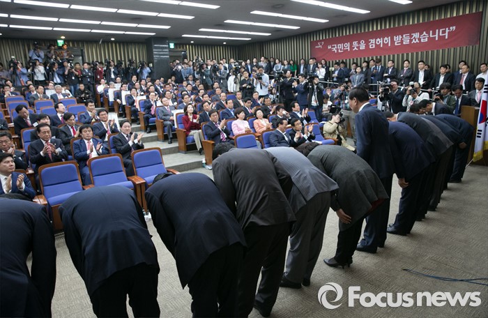 (서울=포커스뉴스) 26일 오전 서울 여의도 국회에서 열린 새누리당 20대 총선 당선자 워크숍에 참석한 원유철 원내대표 등 경기도 지역 당선인들이 인사하고 있다.