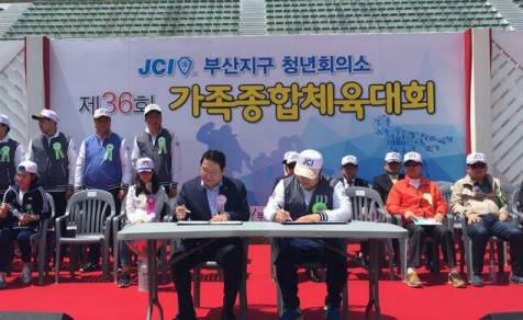 지난 1일 부산 사직운동장 보조경기장에서 열린 협약식에는 골든블루 최용석 부회장, 부산지구 JC 한문갑 회장을 비롯 회원과 가족 등 약 1000여명이 참석했다.