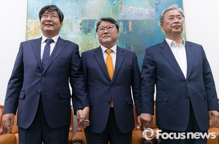 (서울=포커스뉴스) 조원진(가운데) 새누리당 원내수석부대표, 이춘석(왼쪽) 더불어민주당 원내수석부대표, 유성엽 국민의당 원내수석부대표가 27일 오후 서울 여의도 국회에서 19대 마지막 임시국회 의사일정 및 쟁점법안 등 논의를 위한 회동에 앞서 취재진을 향해 포즈를 취하고 있다.