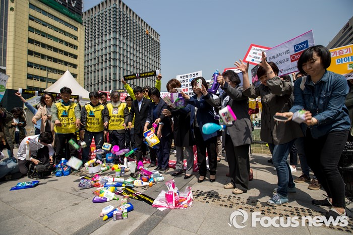 (서울=포커스뉴스) 25일 오전 서울 종로구 광화문 광장에서 옥시 가습기 살균제 피해 가족 및 환경단체 관계자들이 옥시 상품 불매를 촉구하는 퍼포먼스를 펼치고 있다.