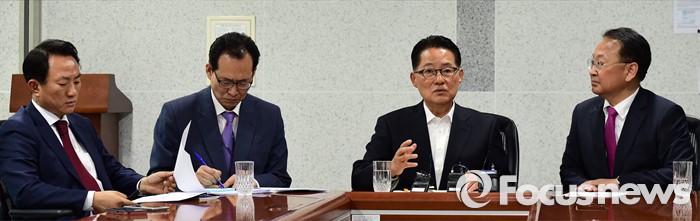 (서울=포커스뉴스) 박지원(왼쪽 세번째) 국민의당 원내대표가 29일 오전 서울 여의도 국회 의원회관에서 경제활성화법안 등 처리 요청을 위해 방문한 유일호(오른쪽 첫번째) 경제부총리 겸 기획재정부 장관과 면담을 하고 있다.