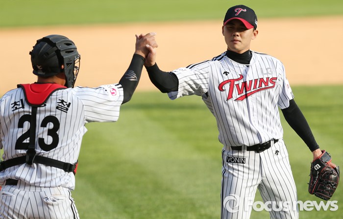 (서울=포커스뉴스) 1일 서울 잠실구장에서 열린 2016 프로야구 kt-LG 경기에서 세이브를 따낸 LG 투수 임정우가 포수 최경철과 하이파이브하고 있다.