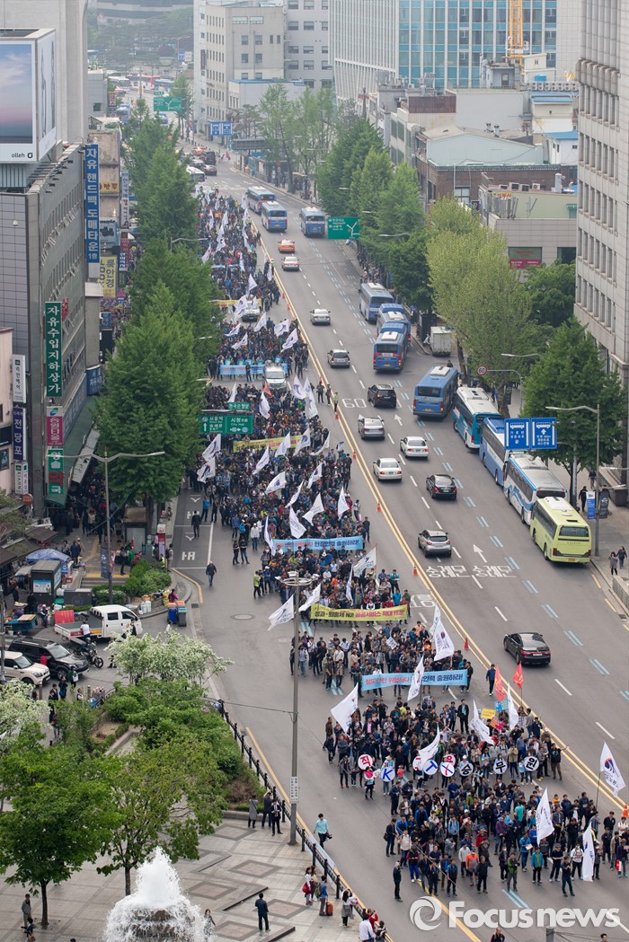 (서울=포커스뉴스) 30일 오후 서울역 광장에서 민주노총 공공운수 전국철도노동조합 회원들이 '철도노동자 1차 총력 결의대회'를 마치고 시내를 행진하고 있다.