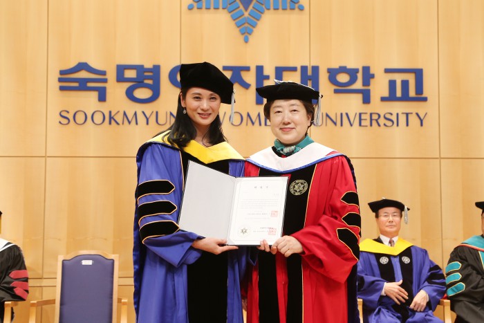 숙명여대 대학원은 "강 단장은 우리나라 문화예술의 우수성을 세계에 알리고 어려운 여건 속에서도 발레에 자신을 바치는 모습이 젊은 여성들에게 귀감이 됐다"며 학위 수여 이유를 밝혔다.강수진 국립발레단장(사진 왼쪽)이 27일 오후 서울 숙명여대에서 명예박사 학위를 받았다. <사진제공=숙명여자대학교>