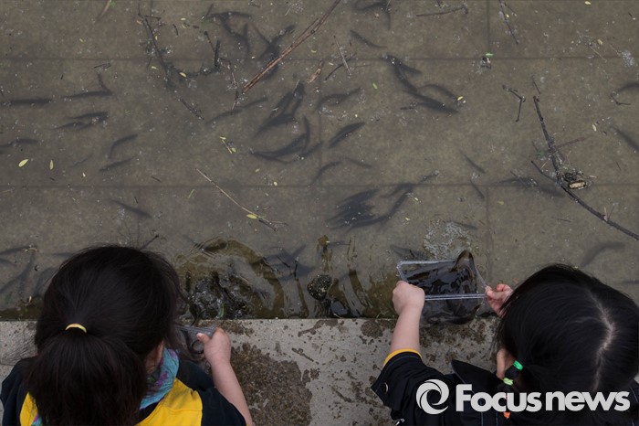 (서울=포커스뉴스) 27일 오전 서울 영등포구 여의도 샛강생태공원에서 어린이들이 모기 퇴치를 위해 미꾸라지를 방류하고 있다.