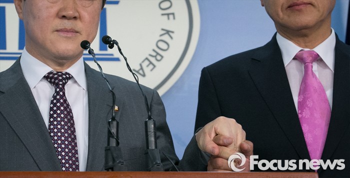 (서울=포커스뉴스) 유기준(왼쪽) 새누리당 의원이 28일 오후 서울 여의도 국회 정론관에서 정책위의장 러닝메이트 후보인 이명수 의원과 원내대표 출마 기자회견 중 손을 잡고 포즈를 취하고 있다.