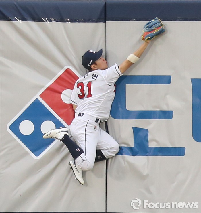 (서울=포커스뉴스) 26일 서울 잠실구장에서 열린 2016 프로야구 SK-두산 경기 1회초 1사 1루에서 두산 중견수 정수빈이 SK 최정의 타구를 펜스에 부딪치며 잡고 있다.