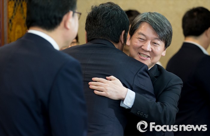 (서울=포커스뉴스) 안철수 국민의당 상임공동대표가 25일 오후 서울 영등포구의 한 중식당에서 제20대 국회의원 선거 서울지역 출마자들과 오찬간담회에 앞서 포옹을 하고 있다.