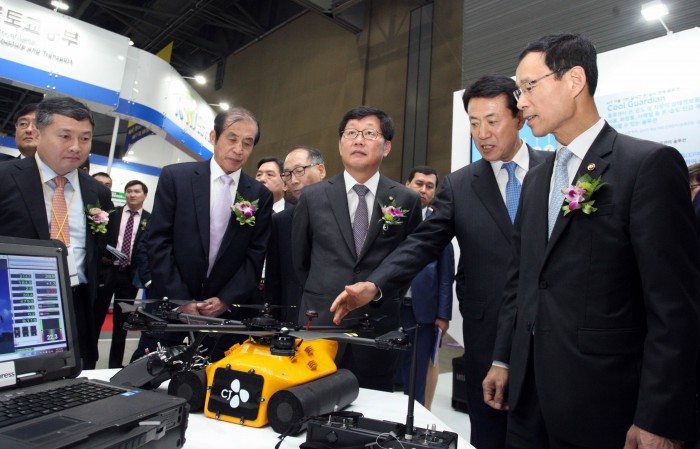 한편, '국제물류산업전' 개회식 이후 이어지는 한국통합물류협회 주관 컨퍼런스에서는 '인더스트리 4.0 시대의 물류기업의 대응전략'을 주제로 CJ대한통운 정태영 TES 전략실장의 강연이 이어질 예정이다.26일 오전 경기 일산 킨텍스 제 1전시장에서 열린 행사에서 최정호 국토교통부 2차관과 손관수 CJ대한통운 대표, 박재억 한국통합물류협회 회장(오른쪽부터) 등 관계자들이 CJ대한통운의 드론 운영 신기술을 살펴보고 있다.<사진제공=CJ대한통운>